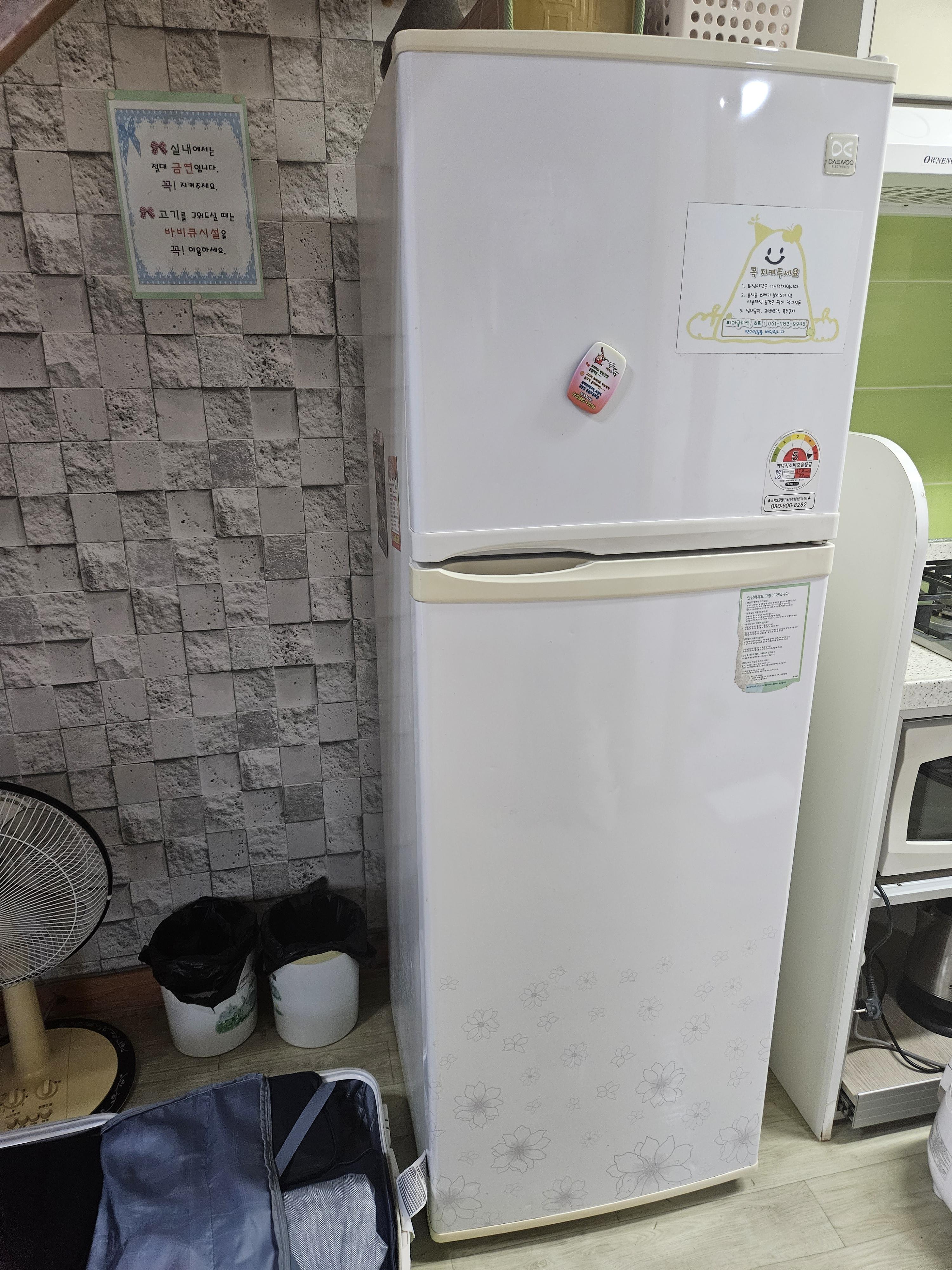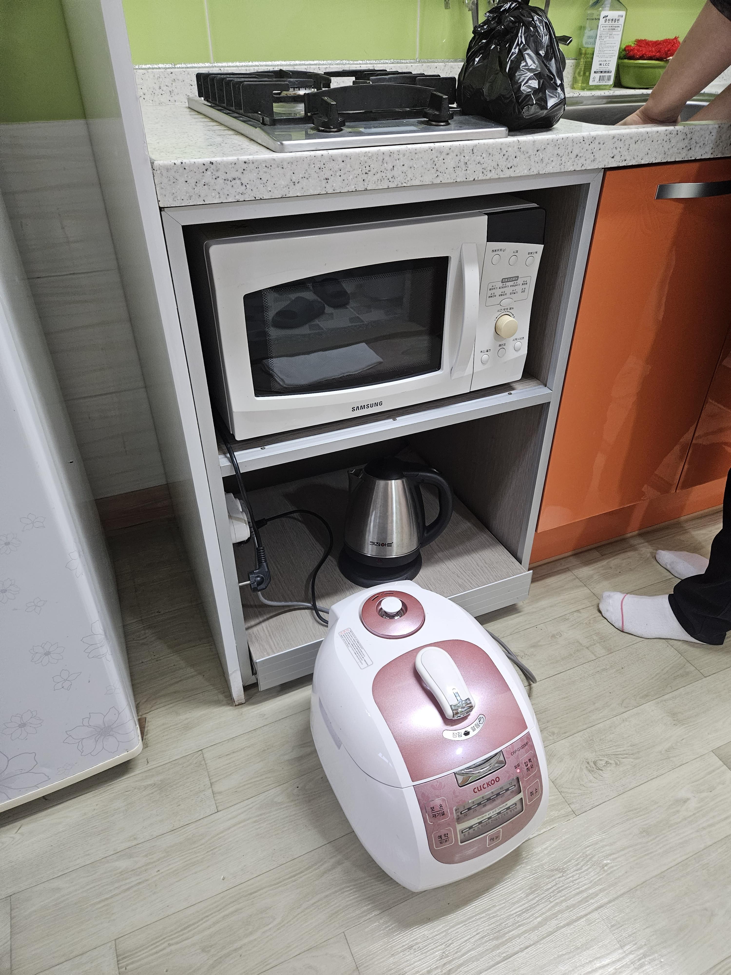 냉장고 우측에는 가스레인지, 전기포트 , 전자레인지 밥솥 다있었어요.