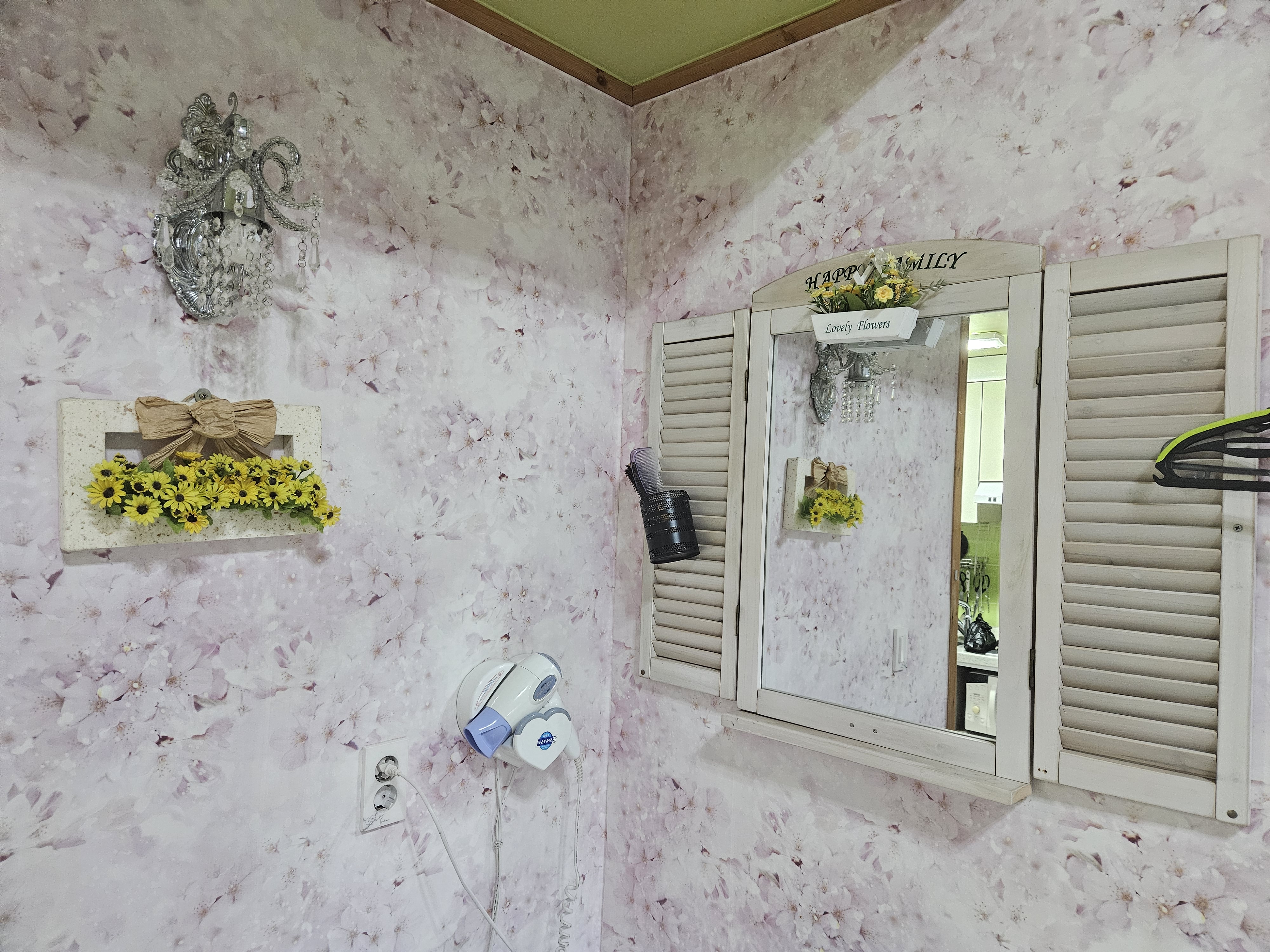 옷걸이 왼쪽에는 드라이기 거울 빗이 배치되어있어요. 드라이기는..나름나름! 없는것보다야 ㅇ_ㅇ..