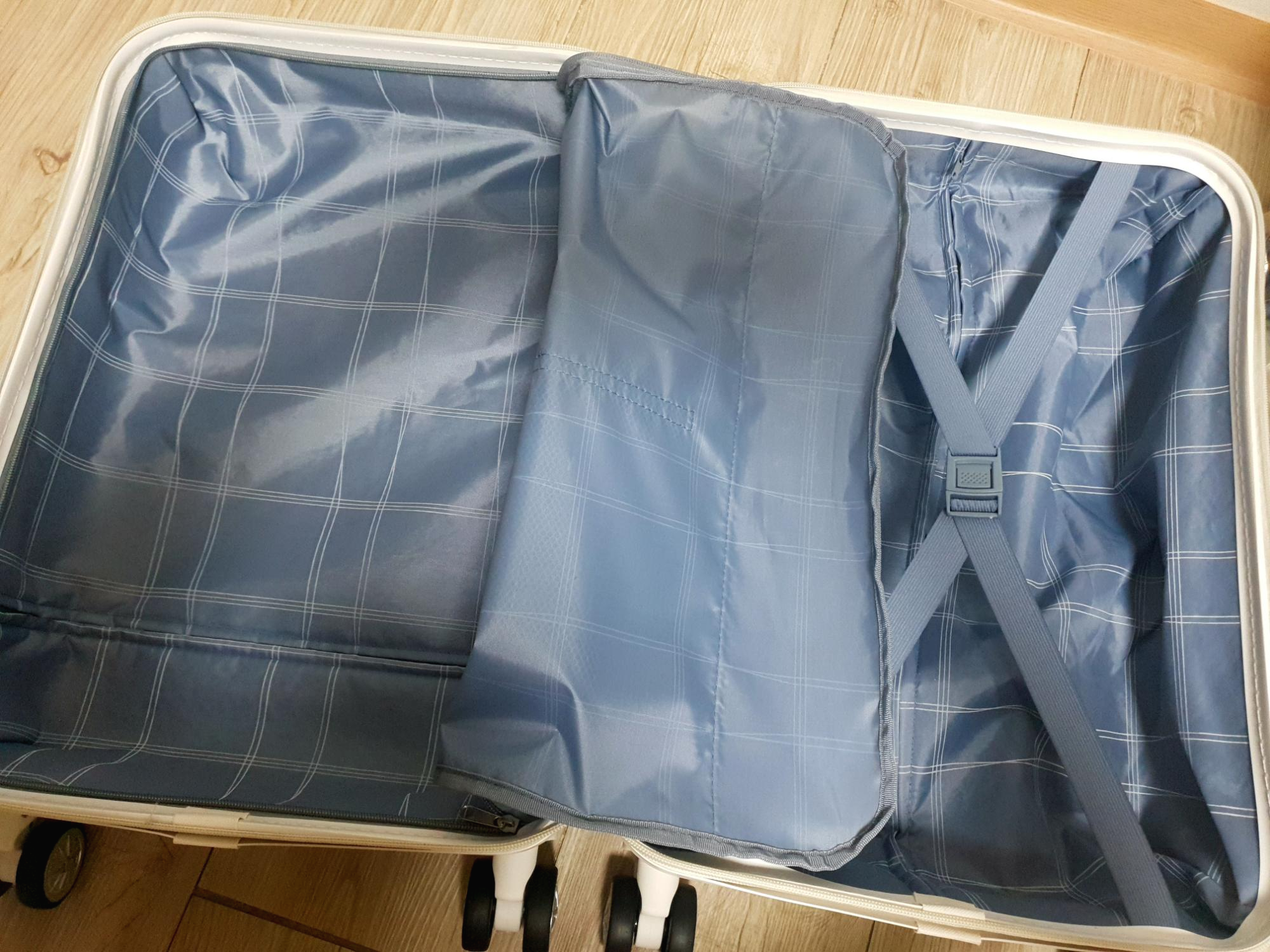 어느 캐리어나 거의 동일하게 X모양 고정벨트가 되어있고 좌측에는 분리수납이 편하도록 2단으로 지퍼가 되어있어요.